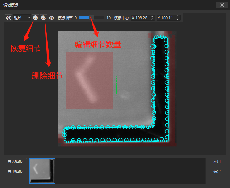 分?jǐn)?shù):對(duì)匹配到的模板相似度進(jìn)行評(píng)判,分?jǐn)?shù)越高,匹配相似度的要求越高; 尺寸:可匹配的模板尺寸范圍,例如±50%,就是模板的50%~150%大小范圍內(nèi)進(jìn)行匹配; 角度:可匹配的模板角度范圍,例如±180°,就是360°任意方向進(jìn)行匹配;; 精度:根據(jù)精度及速度的要求,用戶可以選擇從粗略到高的五個(gè)等級(jí); 嚴(yán)格評(píng)分:是否對(duì)在評(píng)分中考慮丟失、遮擋或模糊的特征; 使用緩存:加速算法的執(zhí)行速度,但是會(huì)占用額外的內(nèi)存; 全圖檢測(cè):用戶點(diǎn)擊如下圖所示的中ROI最大化按鈕即可。